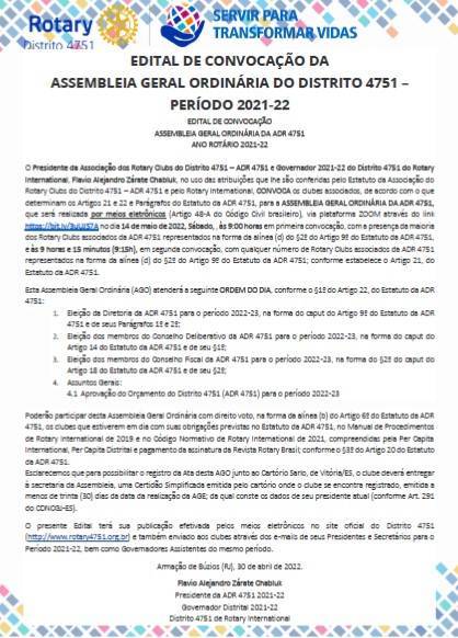 EDITAL DE CONVOCAÇÃO DA ASSEMBLEIA GERAL ORDINÁRIA DO DISTRITO 4751 – PERÍODO 2021-22