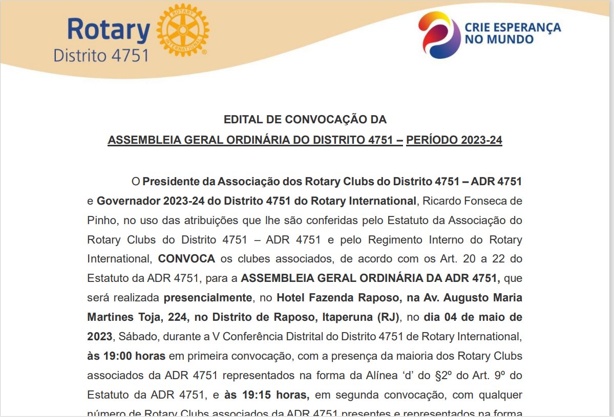 EDITAL DE CONVOCAÇÃO DA ASSEMBLEIA GERAL ORDINÁRIA DO DISTRITO 4751 – PERÍODO 2023-24 O Presidente da Associação dos Rotary Clubs do Distrito 4751 – ADR 4751 e Governador 2023-24 do Distrito 4751 do Rotary International, Ricardo Fonseca de Pinho, no uso das atribuições que lhe são conferidas pelo Estatuto da Associação do Rotary Clubs do Distrito 4751 – ADR 4751 e pelo Regimento Interno do Rotary International, CONVOCA os clubes associados, de acordo com os Art. 20 a 22 do Estatuto da ADR 4751, para a ASSEMBLEIA GERAL ORDINÁRIA DA ADR 4751, que será realizada presencialmente, no Hotel Fazenda Raposo, na Av. Augusto Maria Martines Toja, 224, no Distrito de Raposo, Itaperuna (RJ), no dia 04 de maio de 2023, Sábado, durante a V Conferência Distrital do Distrito 4751 de Rotary International, às 19:00 horas em primeira convocação, com a presença da maioria dos Rotary Clubs associados da ADR 4751 representados na forma da Alínea ‘d’ do §2º do Art. 9º do Estatuto da ADR 4751, e às 19:15 horas, em segunda convocação, com qualquer número de Rotary Clubs associados da ADR 4751 presentes e representados na forma da Alínea ‘d’ do §2º do Art. 9º do Estatuto da ADR 4751; conforme estabelece o Art. 21, do Estatuto da ADR 4751.
