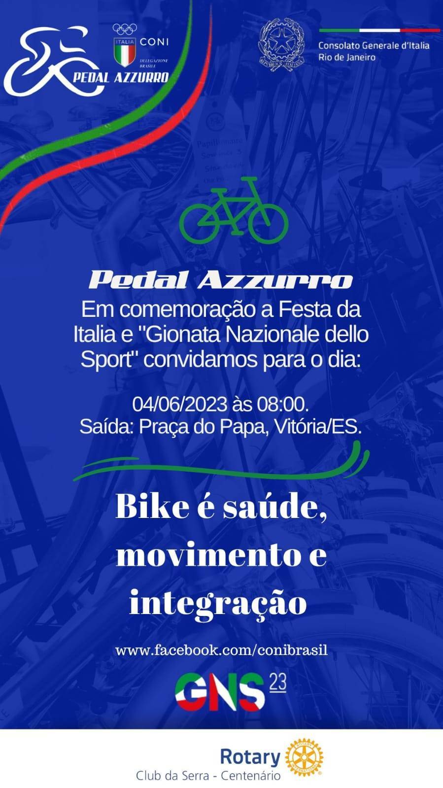 A presidente do Rotary Club da Serra-Centenário tem o prazer de divulgar o evento gratuito e beneficente "Pedal Azzurro", com comemoração á Festa da Itália e a "Giornata Nazionale dello Sport", no dia 4 de junho próximo, às 8h00, com saídana Praça do Papa, em Vitória-ES.