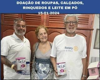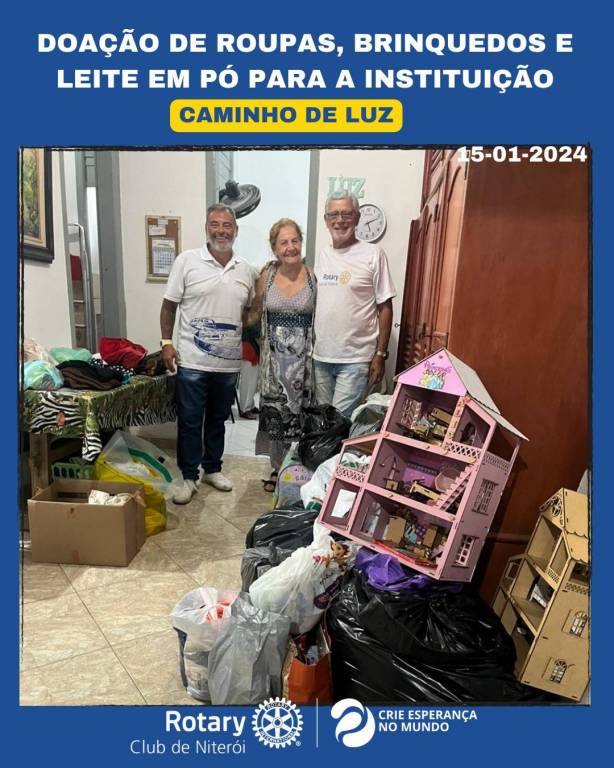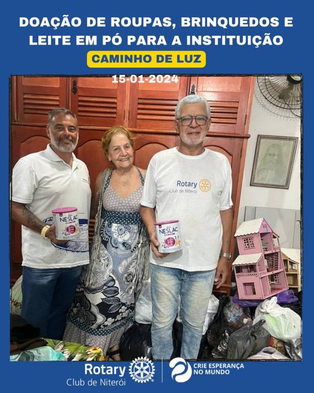 O Rotary Club de Niterói representado pelo presidente Joel Coelho e pelo companheiro Paulo Belchior, fizeram hoje, dia 15/01/2024 doações de roupas, brinquedos e latas de leite em pó infantil para a Instituição Caminho de Luz que ajuda os mais necessitados.