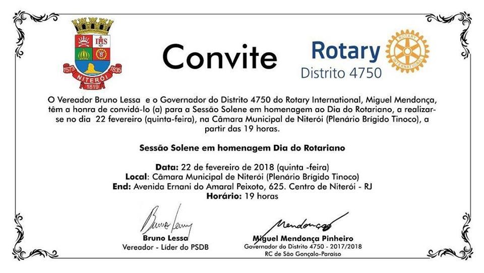 O Vereador Bruno Lessa e o Governador do Distrito 4750 do Rotary Internacional, Miguel Mendonça, tem a honra de convidá-lo (a) para a Sessão Solene em homenagem ao Dia do Rotariano, a realizar-se no dia 22 fevereiro (quinta-feira), na Câmara Munipal de Niterói (Plenário Brigido Tinoco), a partir das 19 horas.