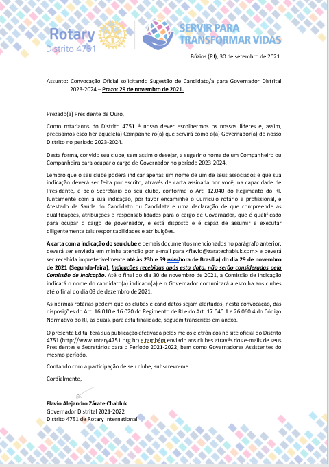 Desta forma, convido seu clube, sem assim o desejar, a sugerir o nome de um Companheiro ou Companheira para ocupar o cargo de Governador no período 2023-2024.