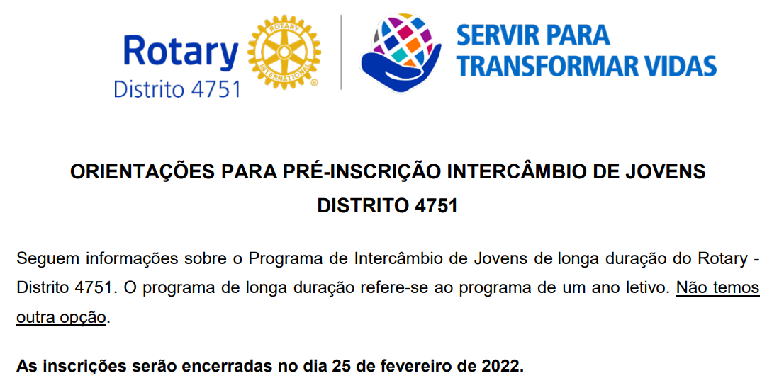 ORIENTAÇÕES PARA PRÉ-INSCRIÇÃO INTERCÂMBIO DE JOVENS DISTRITO 4751 Seguem informações sobre o Programa de Intercâmbio de Jovens de longa duração do Rotary - Distrito 4751. O programa de longa duração refere-se ao programa de um ano letivo. Não temos outra opção. As inscrições serão encerradas no dia 25 de fevereiro de 2022. Para um estudante participar do processo seletivo ele deverá: Residir em um dos municípios que fazem parte do Distrito 4751; Não ter concluído o ensino médio no ano de 2021; Ter entre 15 e 18 anos incompletos na data da viagem (não pode completar 18 anos antes de agosto de 2022); Ser indicado por um Rotary Club do Distrito 4751; e Atendendo a estes pré-requisitos deverá então preencher o formulário de inscrição (Application Long Term English) em 2 vias (não pode ser preenchido manualmente) e efetuar o depósito de R$ 300,00 na conta da Associação dos Rotary Clubs do Distrito 4751 – Banco SICOOB (N.756), AG. 3007 C/C 157283-0. Lembramos que a taxa de inscrição não será devolvida mesmo que haja desistência do candidato ou se, em função da pandemia, o intercâmbio não puder ser realizado. A próxima fase classificatória acontecerá on-line, no dia 5 de março de 2022, com início às 9:30 horas para os candidatos que viajarão em 2022. As provas de seleção constarão dos seguintes assuntos: Conhecimentos Gerais, Conhecimentos de Rotary (livro ABC de Rotary disponível no site do programa), inglês, além de uma entrevista com psicólogos. Depois da seleção o candidato deverá participar de reuniões de treinamento e orientação acompanhados sempre dos responsáveis (pai/mãe). Neste treinamento apresentaremos todas as regras do programa. O não comparecimento a estes treinamentos representará a eliminação do candidato do programa de intercâmbio de jovens. Lembramos que não garantimos colocação para todos os candidatos, e que a cada ano temos um determinado número de vagas em países diversos que serão preenchidas de acordo com o desempenho e a consequente classificação nas provas. (As vagas serão oferecidas à medida que recebemos informação de disponibilidade). Assim, ao primeiro colocado será oferecido cada vaga recebida e assim sucessivamente. Lembrando ainda que temos que respeitar às exigências de idade de cada país. Após a escolha do país deverá ser efetuado o pagamento de R$ 4.850,00 (Quatro mil oitocentos e cinquenta reais) e após a chegada do Guarantee Form (documento para iniciar a solicitação de visto de estudante) deverá ser efetuado o pagamento de outra parcela de R$ 4.850,00 (Quatro mil oitocentos e cinquenta reais), totalizando R$ 10.000,00 (Dez mil reais). Além disso, deverá ser dado um cheque caução, no valor de R$ 1.500,00, que será depositado nos casos em que o intercambiário que sai do Brasil tenha um retorno antecipado por quebra de regras do programa, independente da data ou por vontade própria cumprindo menos de 9 meses do intercâmbio, e ainda se a família anfitriã deixar de atender as determinações do programa. O jovem deverá levar em torno de US$300 – US$500,00 (varia de país para país) para o fundo de emergência que ficará com o conselheiro do país que o receber e que se não for utilizado, será devolvido ao intercambiário no final do período de intercâmbio. Deverá também arcar com a passagem aérea (com validade de 1 ano), além do seguro de vida e saúde, uniforme, visto e recursos para suas despesas pessoais. Alguns países exigem que o candidato faça um pequeno curso do idioma logo que chegue ao país e neste caso o candidato também terá que arcar com este custo (Alemanha, Finlândia, etc). Esse valor varia de 200 a 500 Euros, dependendo do país. O candidato deverá indicar além da sua família que será a primeira família a hospedar o/a intercambista mais três famílias hospedeiras na mesma cidade, que não deverão ser parentes próximos, pois o programa determina que os intercambistas convivam com pelo menos três famílias. Estas famílias serão entrevistadas por algum representante do Rotary para avaliar se realmente estão dispostas a hospedar um intercambista. (Preencher formulário “Famílias Anfitriãs”). O candidato também deverá obter uma vaga na escola em que ele estuda ou em outra no mesmo padrão para o intercambista (normalmente as escolas concedem uma bolsa de estudo para os estrangeiros). Não será permitido que o estudante estrangeiro seja matriculado em escolas municipais ou estaduais, a não ser nos casos em que seja comprovado através de histórico escolar que o candidato ao programa de intercâmbio estudava em uma destas escolas. Podemos considerar exceções para escolas do padrão IFES / IFF. Caso a família não consiga esta bolsa ela deverá arcar com estes custos, considerando que no exterior os nossos intercambistas nunca pagam a escola. Além do formulário de inscrição (Application) o candidato deverá preencher: Contrato; Certificado de imunização (Immunization Certificate); Compromisso de hospedagem de famílias anfitriãs; Declaração juramentada para trabalho com jovens/renúncia/anuência/exoneração (Os pais de cada família hospedeira deverão preencher este documento e assinar); Atestado de recebimento das normas e requisitos do programa. O candidato também deverá anexar cópia do passaporte e histórico escolar traduzido para o inglês (não é necessária tradução juramentada neste momento). Toda a documentação, após preenchida e com as devidas assinaturas, deverá ser escaneada e enviada para os seguintes e-mails: [email protected] e [email protected]