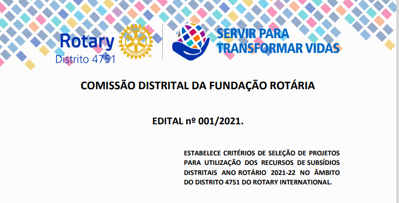 EDITAL ESTABELECE CRITÉRIOS DE SELEÇÃO DE PROJETOS PARA UTILIZAÇÃO DOS RECURSOS DE SUBSÍDIOS DISTRITAIS ANO ROTÁRIO 2021-22 NO ÂMBITO DO DISTRITO 4751 DO ROTARY INTERNATIONAL.
