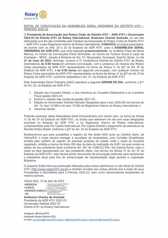 Presidente da Associação dos Rotary Clubs do Distrito 4751 – ADR 4751 e Governador 2022-23 do Distrito 4751 do Rotary InternationalAnderson Charles Andrade, no uso das atribuições que lhe são conferidas pelo Estatuto da Associação do Rotary Clubs do Distrito 4751 – ADR 4751 e pelo Regimento Interno do Rotary International, CONVOCA os clubes associados, de acordo com os Arts. 20 a 22 do Estatuto da ADR 4751, para a ASSEMBLEIA GERAL ORDINÁRIA DA ADR 4751, que será realizada presencialmente, no Auditório Praia de Santa Mônica, no Centro de Convenções Flávio Schneider, no Centro de Turismo Social e Lazer de Guarapari - SESC, situado à Rodovia do Sol, 01, Muquiçaba, Guarapari, Espírito Santo, no dia 21 de maio de 2023, domingo, durante a IV Conferência Distrital do Distrito 4751 de Rotary International, às 8:00 horas em primeira convocação, com a presença da maioria dos Rotary Clubs associados da ADR 4751 representados na forma da Alínea ‘d’ do §2º do Art. 9º do Estatuto da ADR 4751, e às 8:30 horas, em segunda convocação, com qualquer número de Rotary Clubs associados da ADR 4751 representados na forma da Alínea ‘d’ do §2º do Art. 9º do Estatuto da ADR 4751; conforme estabelece o Art. 21, do Estatuto da ADR 4751.