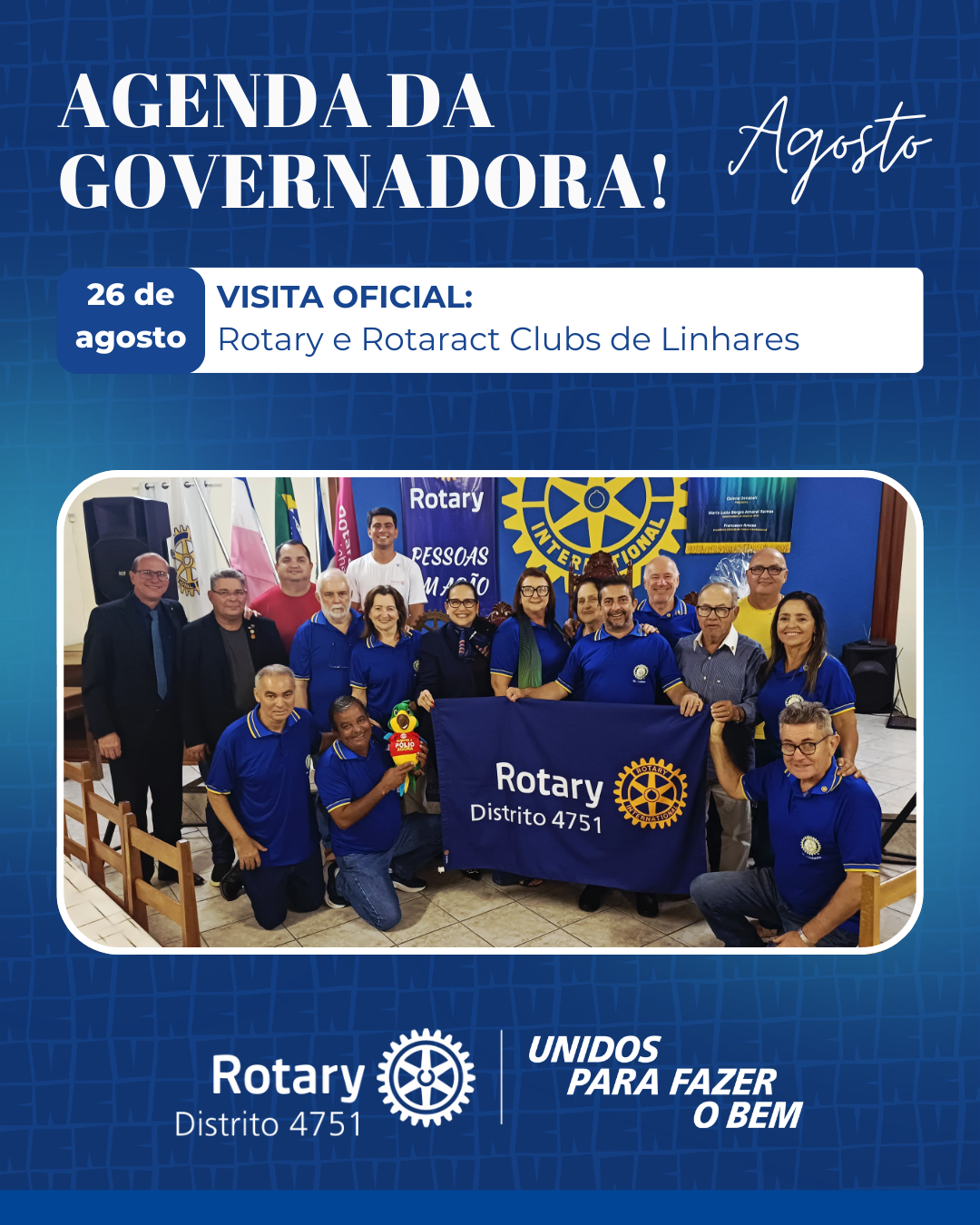 No dia 26 de agosto de 2025, os Rotary e Rotaract Clubs de Linhares receberam com entusiasmo a Governadora Maria Luzia Borges do Amaral Ramos e seu esposo Luiz Almir em sua Visita Oficial.