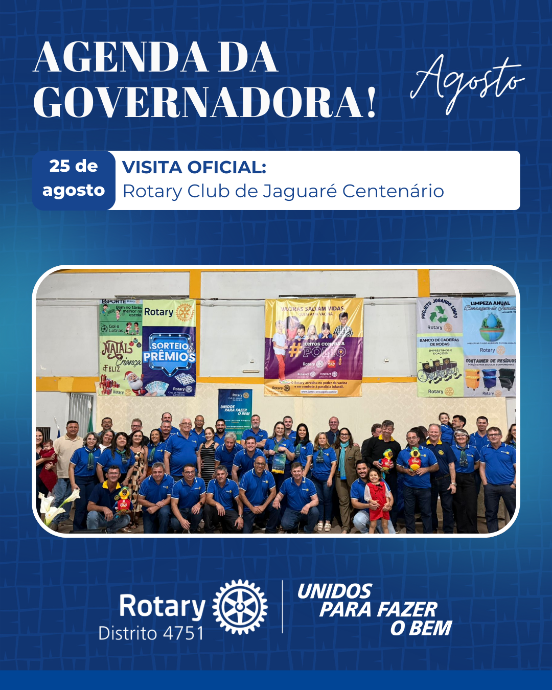 No dia 25 de agosto de 2025, o Rotary Club de Jaguaré Centenário recebeu com alegria a Governadora Maria Luzia Borges do Amaral Ramos e seu esposo Luiz Almir em sua Visita Oficial.