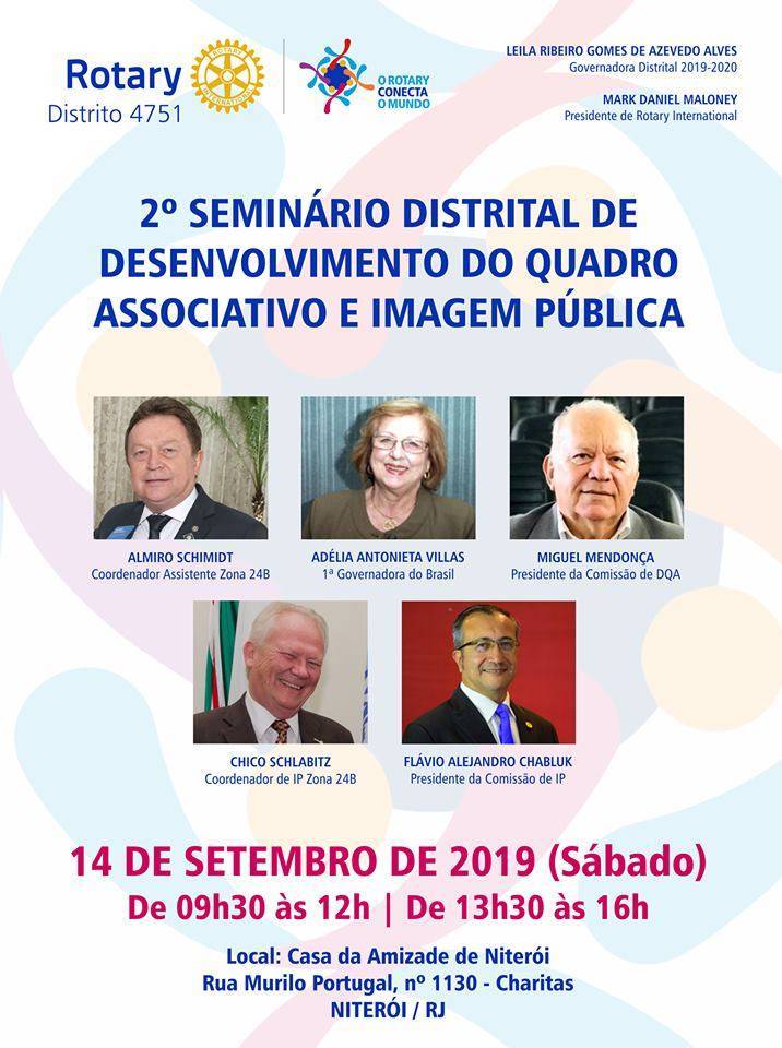No próximo dia 14 de setembro (sábado), o Distrito 4751 realizará o segundo SEMINÁRIO DISTRITAL DE DESENVOLVIMENTO DO QUADRO ASSOCIATIVO E IMAGEM PÚBLICA, na cidade de Niterói/RJ. A presença dos companheiros será muito especial para todos nós!