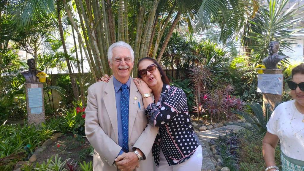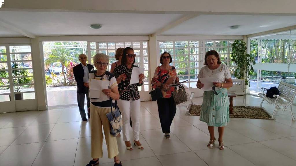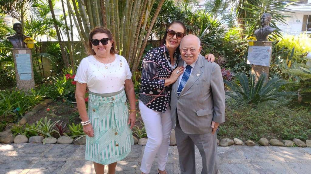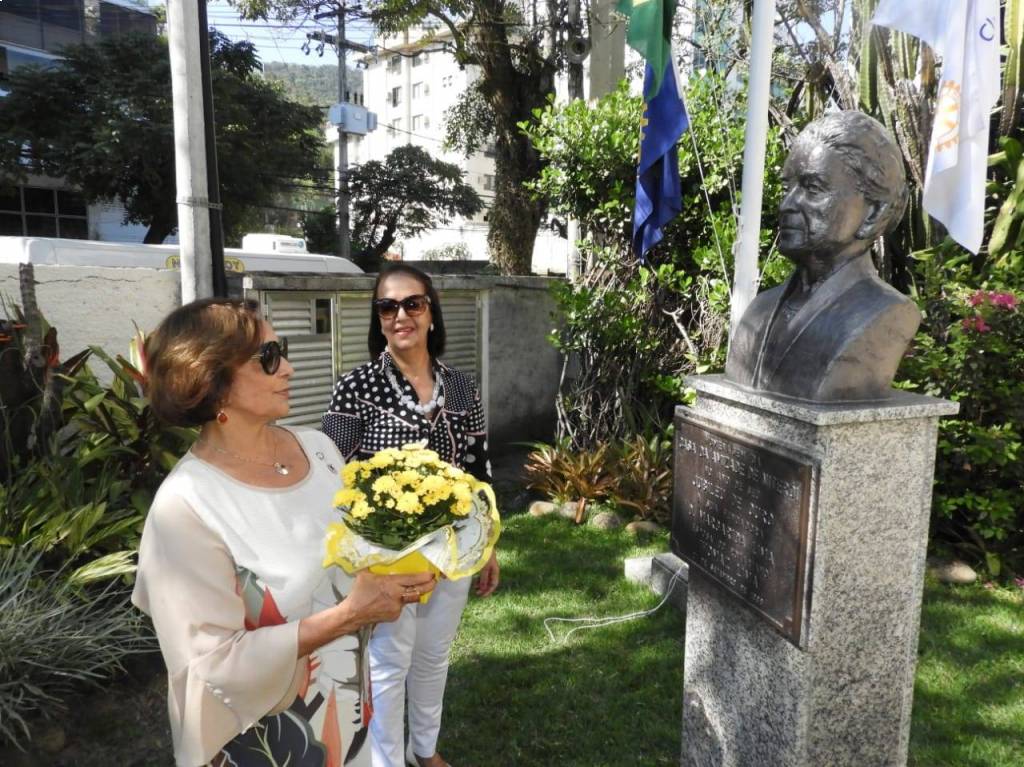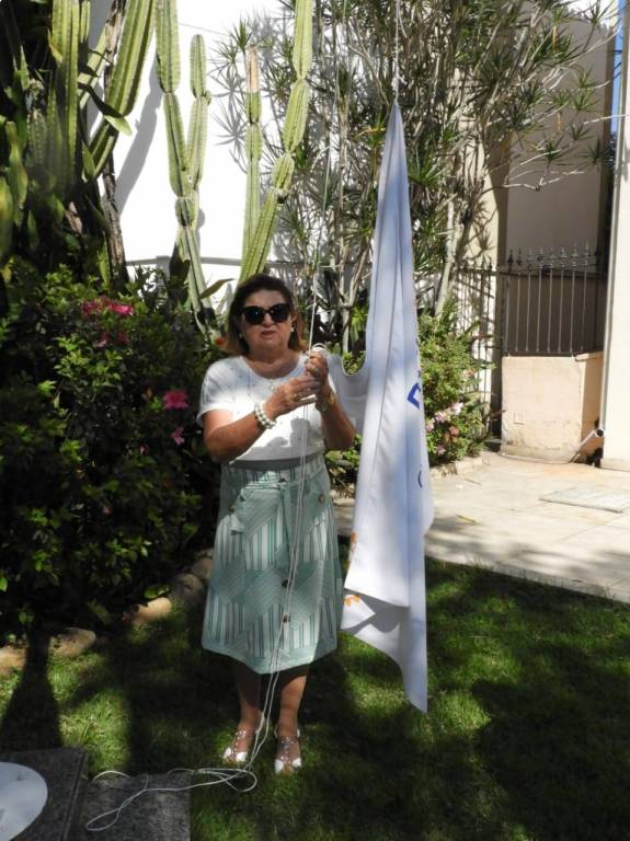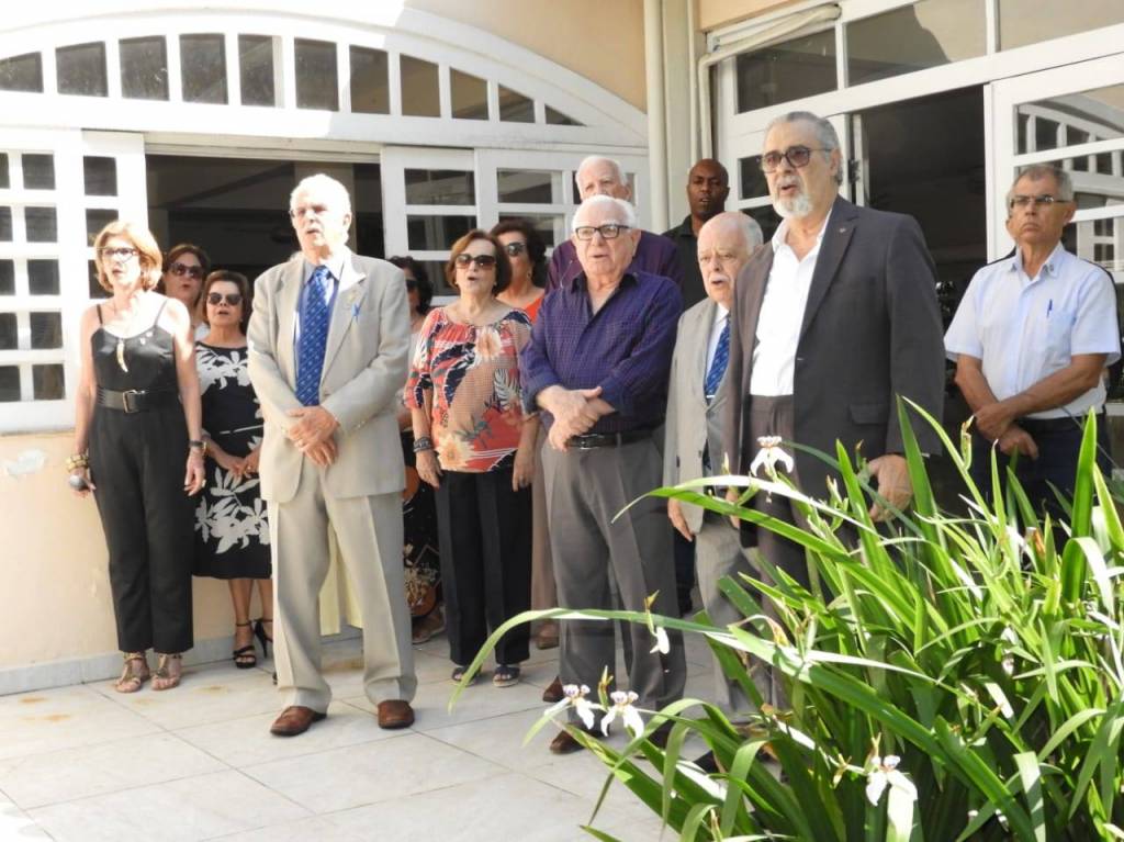 Todos acompanharam o hasteamento das bandeiras e a colocação de flores nos bustos de Paul Harris, Ernesto Imbassahy de Melo e Margarida Lima, junto à Representante Distrital das Casas da Amizade, Marlene Ribeiro.