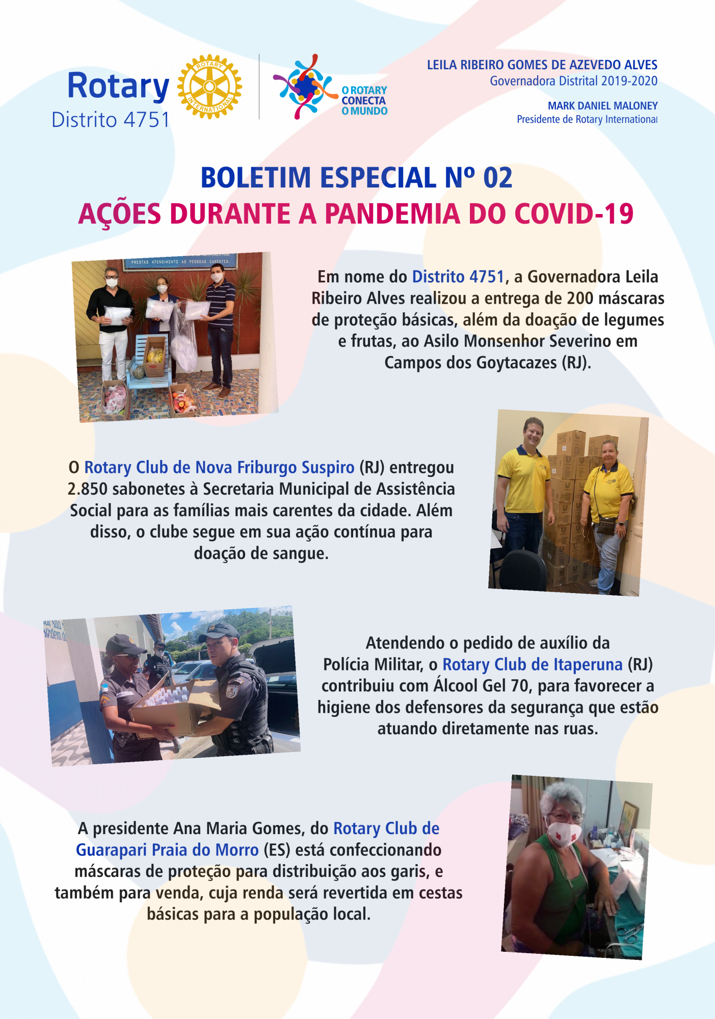 Os clubes do Distrito 4751 de Rotary International (RJ e ES) estão trabalhando, dentro de suas possibilidades, em ações diversificadas de combate ao novo coronavírus.