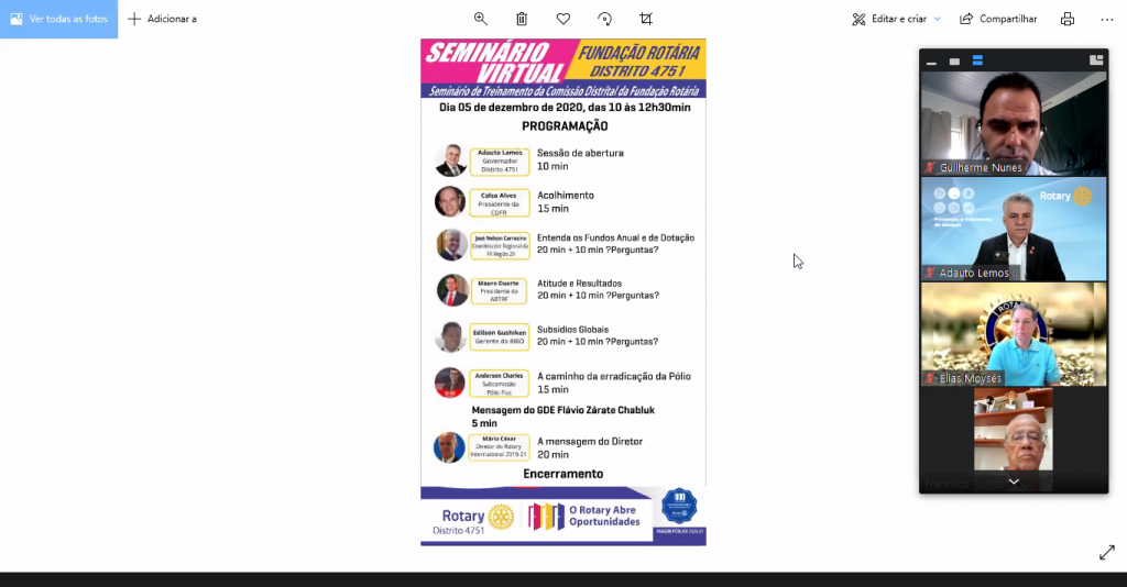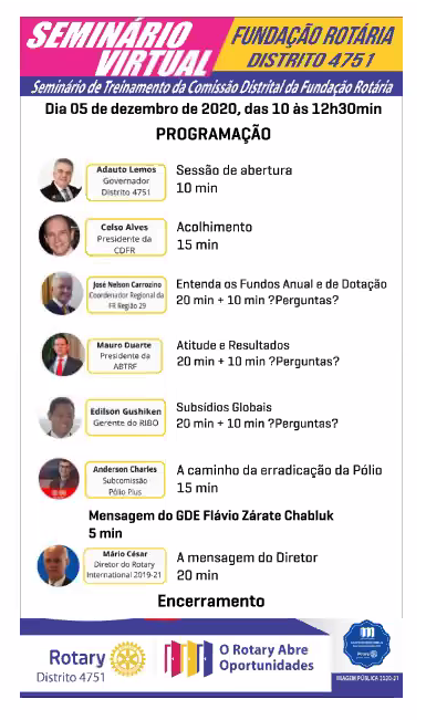 Realização de um grande evento virtual pelo Zoom, coordenado brilhantemente pelo nosso Governador 20-21 Adauto Lemos e sua equipe distrital da Fundação Rotária. Presença marcante dos Clubs do Distrito 4751 e de palestrantes e convidados ilustres e de renome dentro da família rotária do Brasil e do mundo.