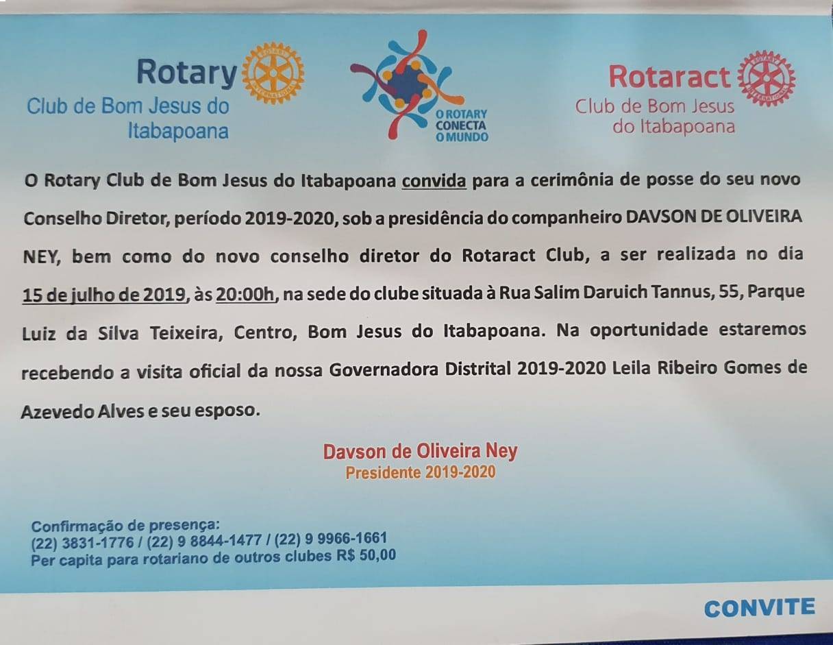 O Rotary Club de Bom Jesus do Itabapoana tem a honra de convidar vossa senhoria, família e companheiros de clube para participarem da cerimônia festiva de POSSE DA NOVA DIRETORIA 2019-2020, no dia 15 de julho de 2019, às 20h, na sede do clube, situada à Rua Salin Tannus, 55, Centro, Bom Jesus do Itabapoana, RJ, propriedade atrás da Prefeitura Municipal. Na oportunidade estaremos recebendo a VISITA OFICIAL DA GOVERNADORA DISTRITAL Leila Ribeiro Gomes de Azevedo Alves e seu esposo, bem como a posse da nova diretoria do ROTARACT CLUB. Informamos que a per capita será de R$ 50,00 por rotariano e convidados de outros clubes, incluindo jantar, água e refrigerante. Solicitamos a confirmação pelos telefones: 22 - 999661661 (Davson), 22 - 38312444 (Júlio) 22 - 98808-1000 (Filipe) ou 22 - 3831-1778(Sonia ou Roney) ou, ainda, por e-mail: [email protected].