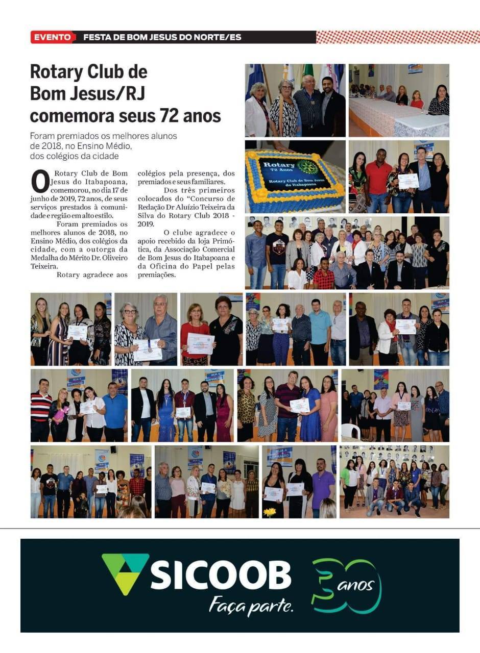 O Rotary Club de Bom Jesus é destaque na Revista O Empresário pelos seus 72 anos comemorados no dia 17 de junho, com a tradicional entrega da Medalha do Mérito Dr Oliveiro Teixeira e da premiação aos melhores alunos do Concurso de Redação Dr Aluízio Teixeira da Silva.
