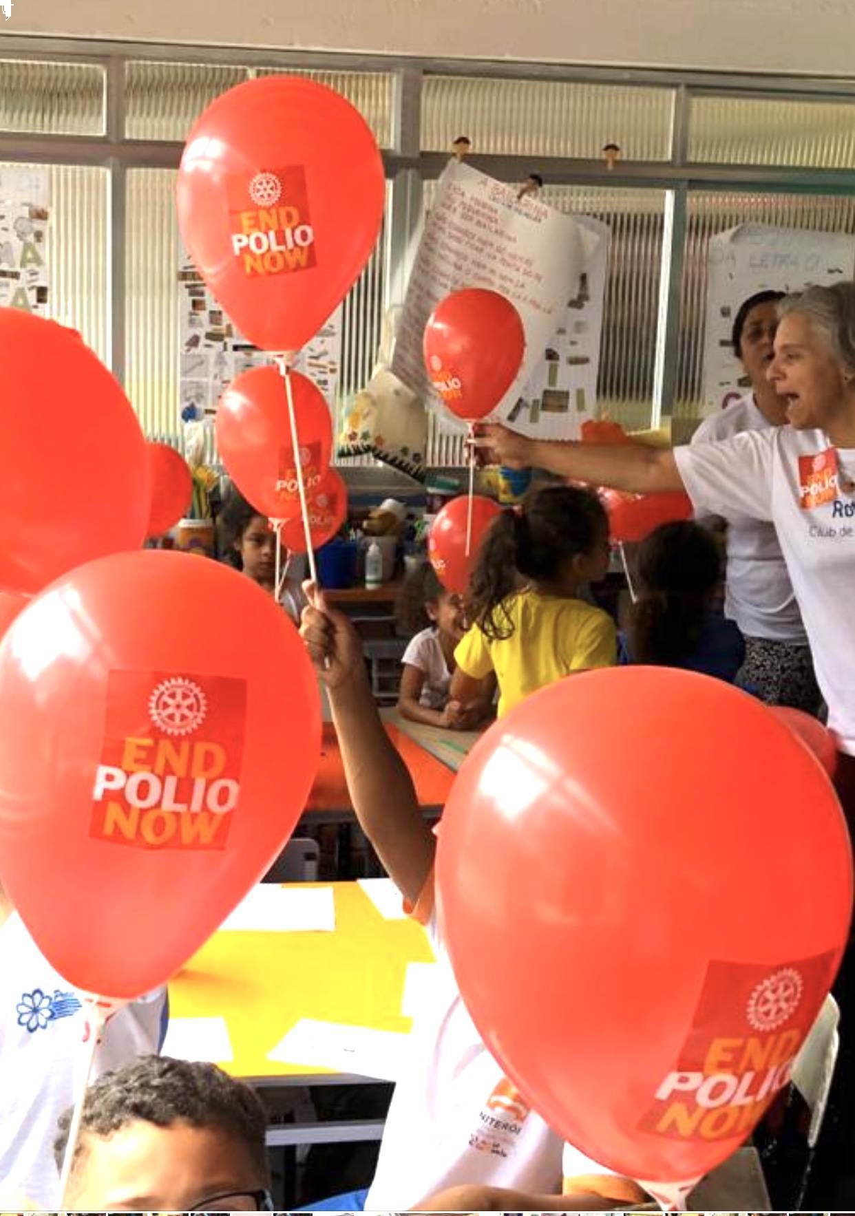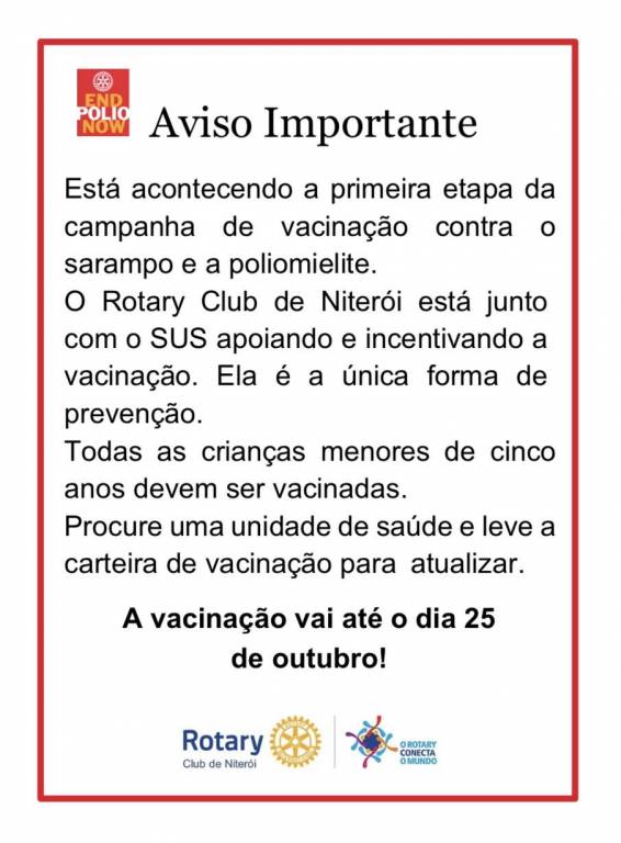 Os companheiros do RC de Niterói divulgaram e incentivaram a vacinação da pólio e sarampo para as crianças, responsáveis e toda comunidade escolar da Creche Comunitária e C.E. Fernando Magalhães, em Jurujuba. Foram distribuídas bolas com o adesivo "EndPolioNow", e folhetos informativos.