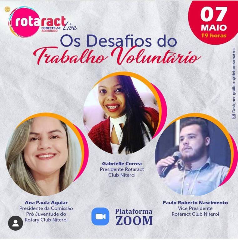 A Live foi realizada pelo aplicativo Zoom, no dia 07 de maio, conduzida pela presidente da Comissão Pró Juventude do RC de Niterói. companheira Ana Paula Aguiar. Foi excelente o bate papo realizado com companheiros do rotary, rotaractianos e convidados. A presidente do Rotaract Gabrielle Correa falou-nos sobre o trabalho de doação e o que o rotaract realizou durante a sua gestão. Outros também deram o seu depoimento sobre o trabalho voluntário. Parabéns aos Rotaractianos pela bela iniciativa. "Dar de si antes de pensar em si."
