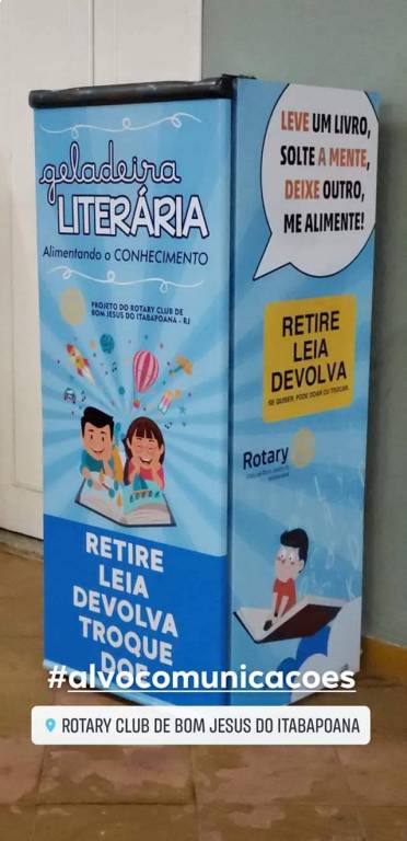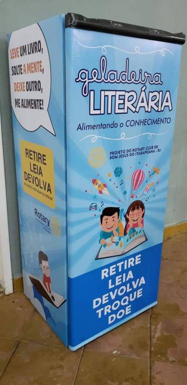 Geladeiras em desuso são limpas e envelopadas com a marca Rotary e o nome do Projeto, completadas com livros, gibis e revistas doadas pela comunidade e colocadas em locais de movimento de pessoas.