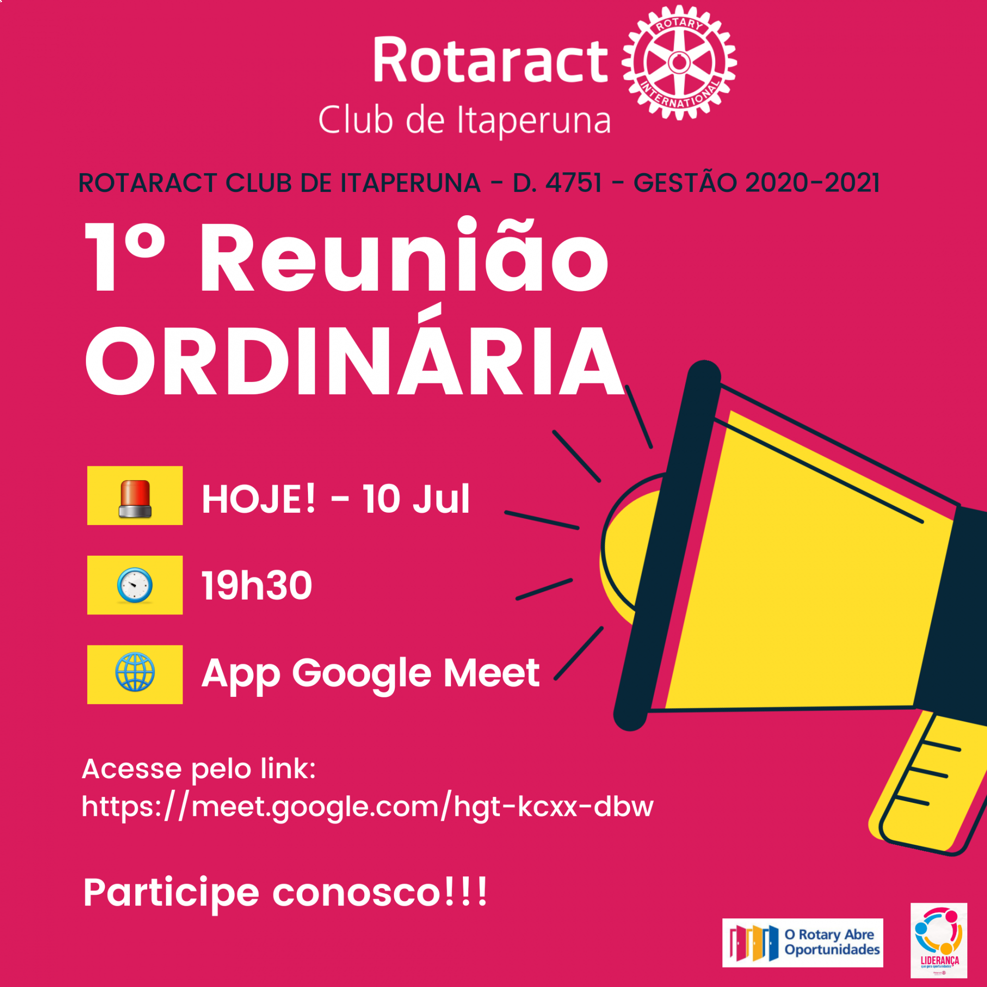 Hoje, dia 10/07, acontecerá a PRIMEIRA Reunião Ordinária da Nova Gestão 2020-2021, do Rotaract Club de Itaperuna.